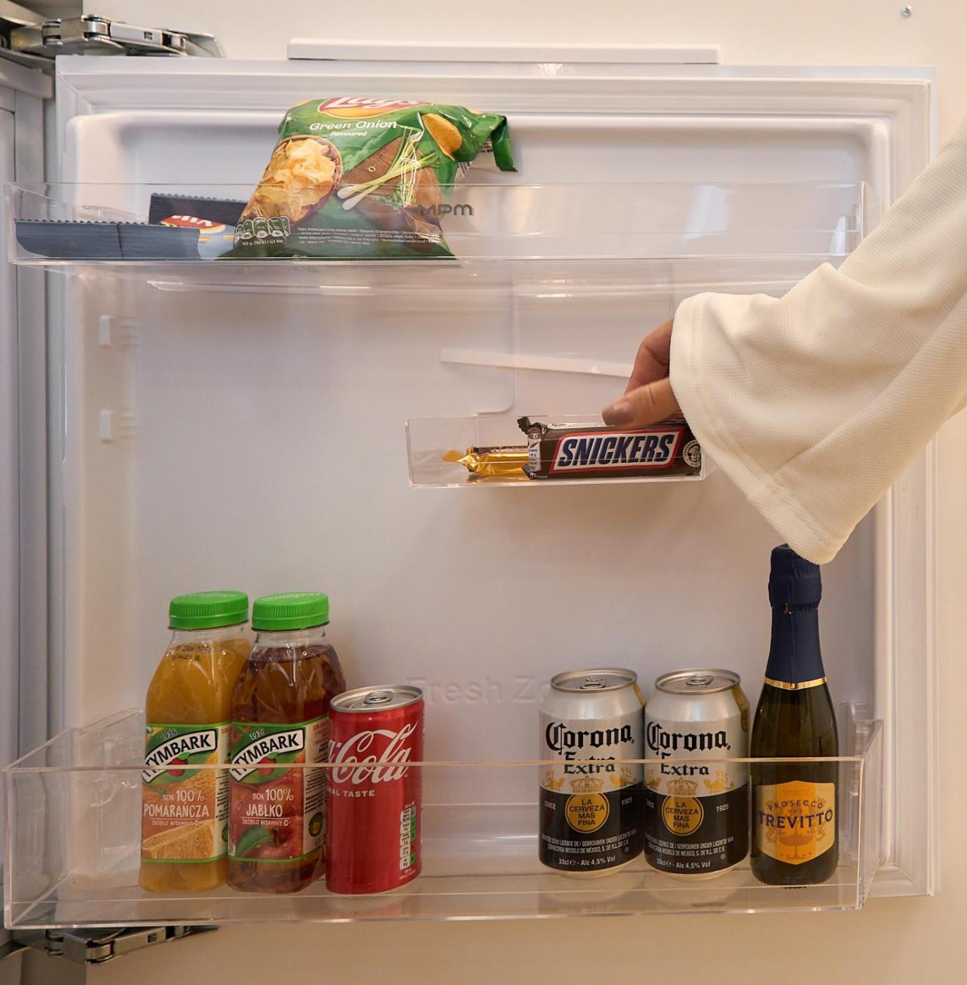 Wyposażenie obejmuje również minibar, płytę kuchenną, ekspres do kawy i czajnik.