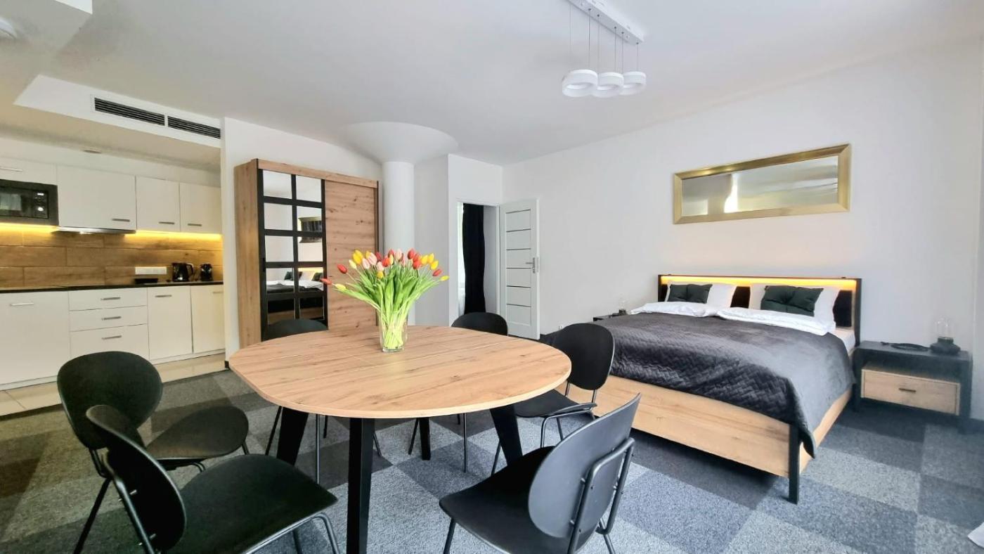 Apartament typu studio. Ten apartament z oddzielnym wejściem obejmuje sypialnię, część wypoczynkową oraz łazienkę z prysznicem i suszarką do włosów. W kompletnie wyposażonym aneksie kuchennym przygotowano płytę kuchenną, lodówkę, zmywarkę do naczyń i przybory kuchenne. W apartamencie znajduje się pralka, zestaw do parzenia kawy i herbaty, jadalnia, szafa oraz telewizor z płaskim ekranem i dostępem do kanałów kablowych. W tej opcji zakwaterowania zapewniono 2 łóżka. Apartament - 4 osobowy. Powierzchnia pokoju ok.: 25 mkw. ;