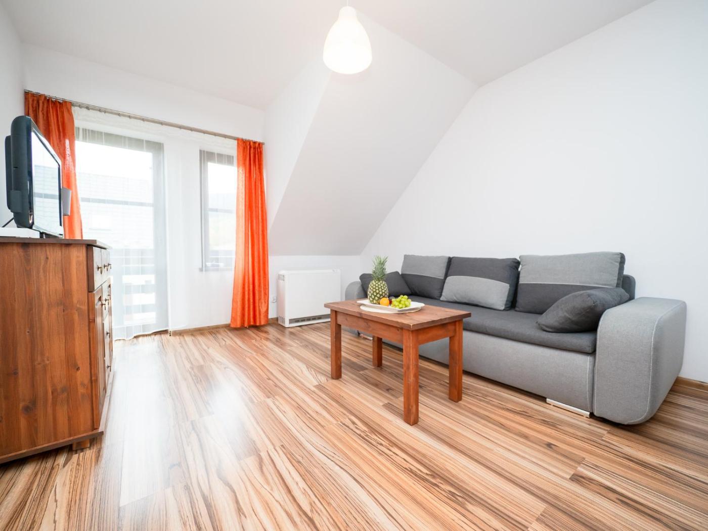 Apartament – parter. Ten apartament z oddzielnym wejściem mieści salon, oddzielną sypialnię oraz łazienkę z kabiną prysznicową. W aneksie kuchennym zapewniono płytę kuchenną, lodówkę, przybory kuchenne i kuchenkę mikrofalową. Dla Gości przygotowano sprzęt do grillowania. Apartament dysponuje częścią wypoczynkową, jadalnią, szafą oraz telewizorem z płaskim ekranem i dostępem do kanałów kablowych. Z okien roztacza się widok na góry. Do dyspozycji Gości są 2 łóżka. Apartament - 5 osobowy. Powierzchnia pokoju ok.: 36 mkw. ;